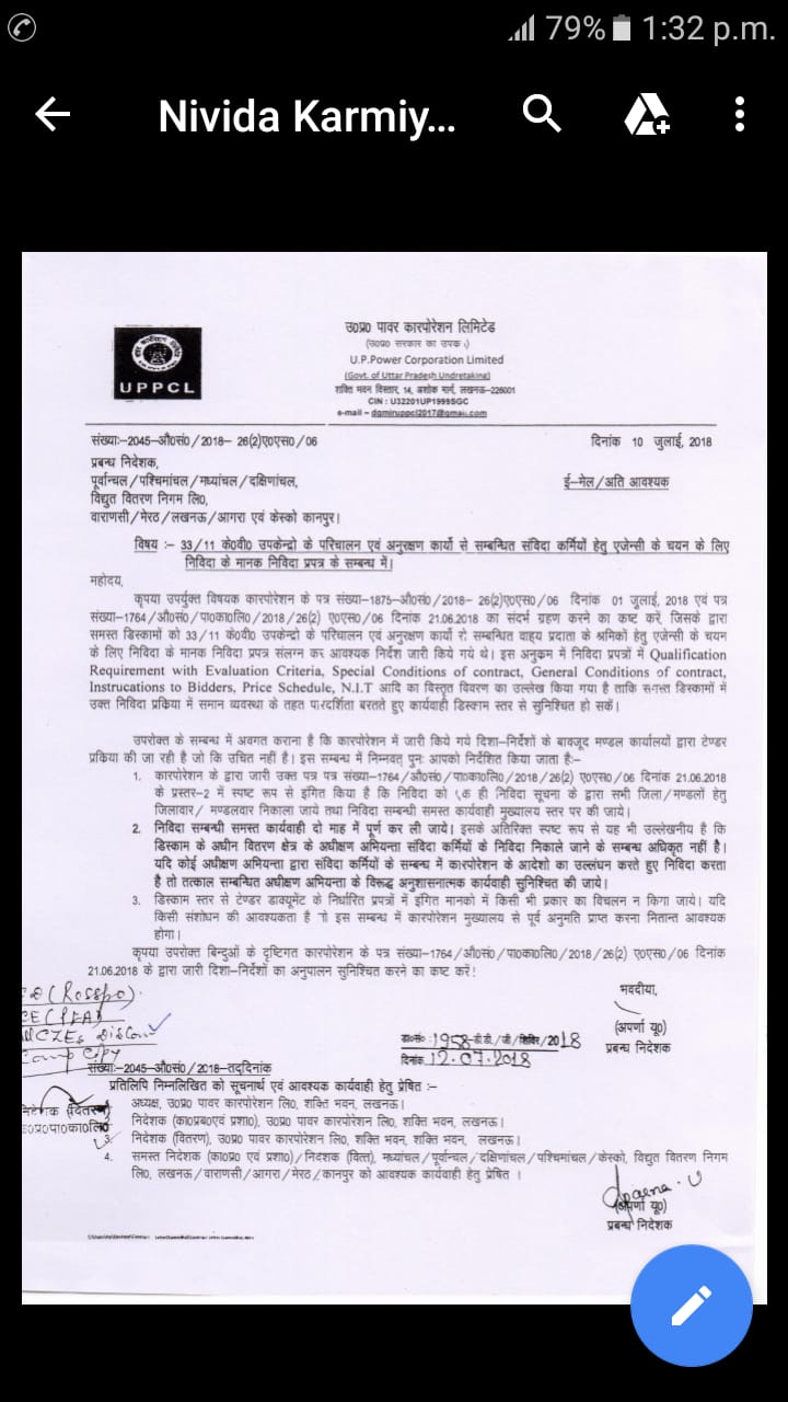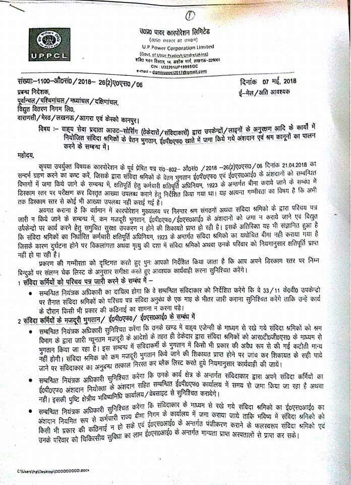 उत्तर प्रदेश विधुत विभाग के अध्यक्ष के 7 मई 2018 को संविदा कर्मचारी आदेश